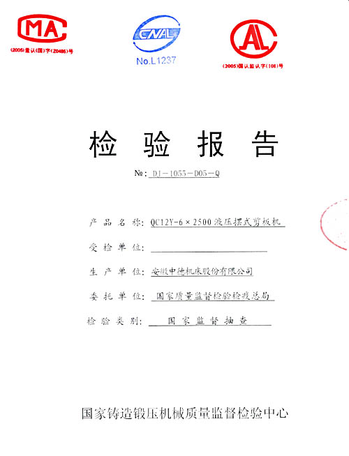 根據(jù)2006年第4季度剪板機(jī)國(guó)家監(jiān)督抽查實(shí)施方案,受國(guó)家質(zhì)量監(jiān)督檢驗(yàn)檢疫總局委托,國(guó)家鑄造鍛壓機(jī)械質(zhì)量監(jiān)督檢驗(yàn)中心,于2006年9月23日,對(duì)本公司產(chǎn)中德牌液壓擺式剪板機(jī)進(jìn)行了現(xiàn)場(chǎng)檢驗(yàn)。近日,我公司收到了本次抽檢的結(jié)果通知單及檢驗(yàn)報(bào)告,結(jié)果為:合格。