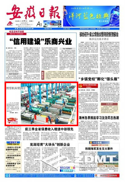 今日(2009年11月11日)《安徽日報》頭版刊載《博望機(jī)床銷四方》的圖片新聞報道。在我公司大型車間圖片中,配出如下文字報道:11月6日,位于當(dāng)涂縣博望鎮(zhèn)的民營企業(yè)安徽中德機(jī)床股份有限公司生產(chǎn)車間里一片繁忙。該企業(yè)今年前三季度銷售量同比增長35%,產(chǎn)品出口30多個國家和地區(qū)。(特約攝影 謝富樂)